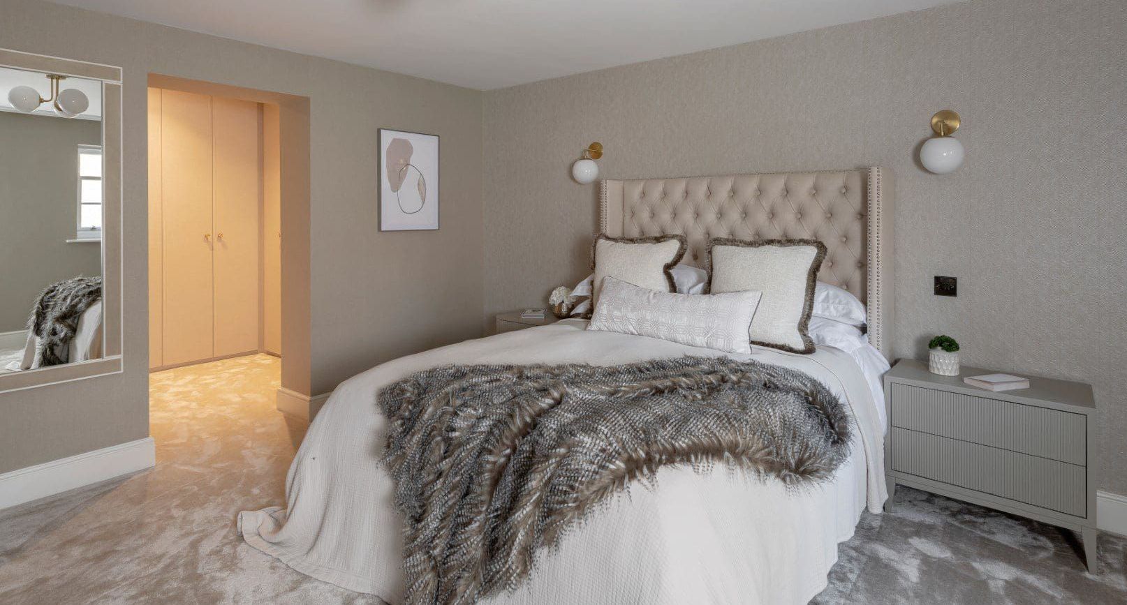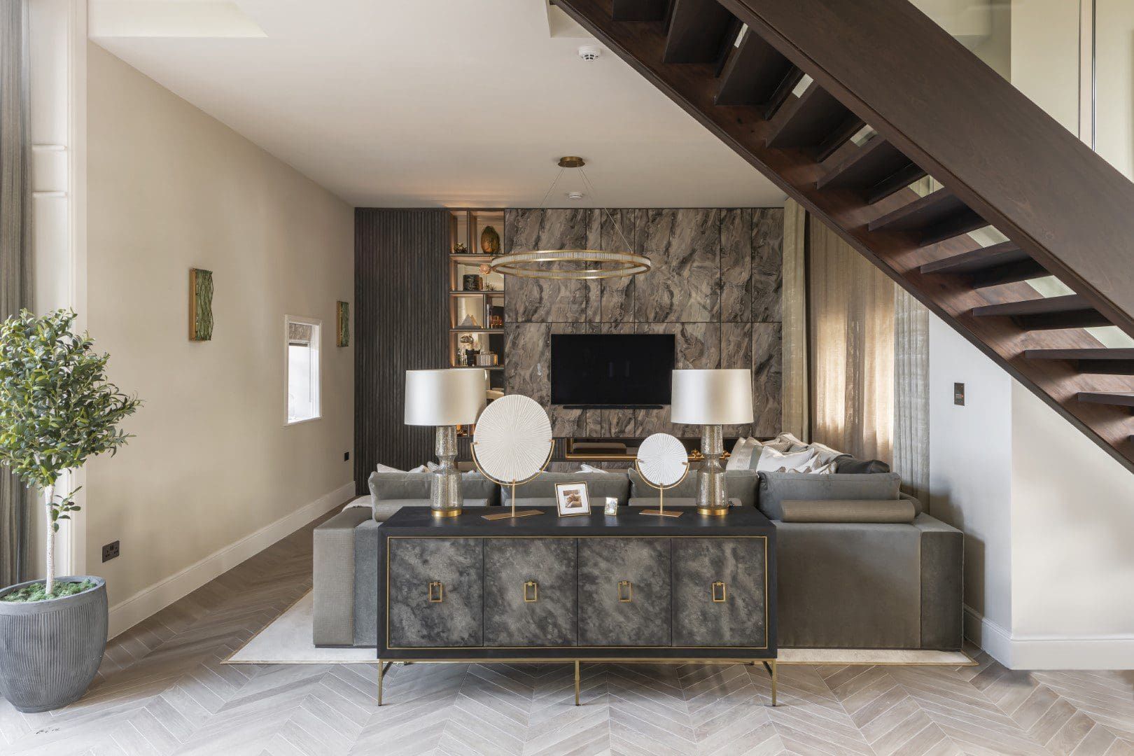 Stapehill Abbey, a Grade II listed gem nestled in the picturesque Dorset countryside, presented Elegant Interiors with a unique opportunity for historic restoration and modern transformation. Originally built in the 19th century, the property underwent a remarkable journey when permission was granted in 2014 to convert it into over 50 private homes. Elegant Interiors was enlisted by the clients who acquired one of the barns within this historic complex. The comprehensive scope of the project included lighting and electrical plans, spatial planning, staircase design, kitchen design, bespoke joinery (wardrobes, dressing room, bar, media wall, study), bathroom design, window treatments, custom upholstery, fabric schemes, and furniture sourcing.